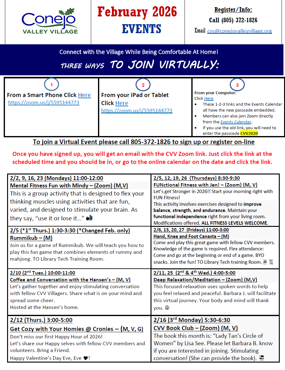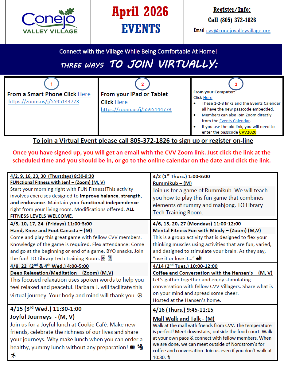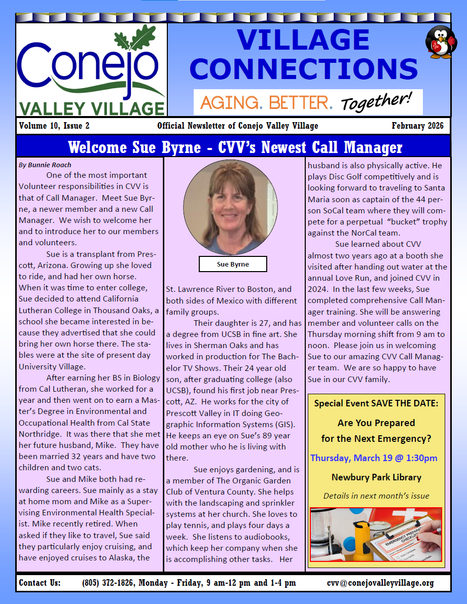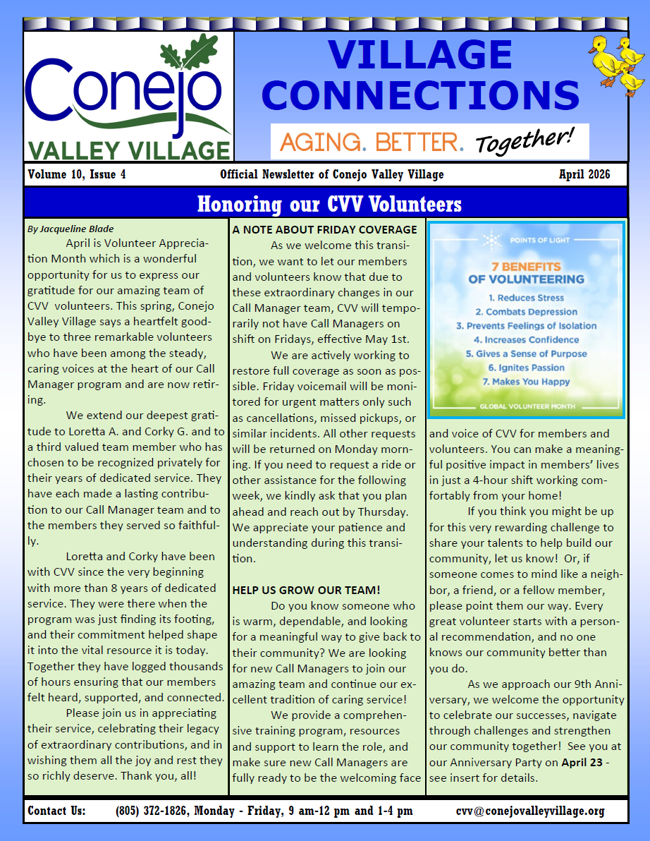 The Conejo Valley Village provides members with access to a network of trained and fully vetted local volunteers with just a phone call. The Village offers services and programs designed to help members stay active, connected to our community, and safely independent in their homes, optimizing their quality of life during the second act. Our 'neighbors helping neighbors' approach gives members and their families greater peace of mind, knowing a local support network is in place.