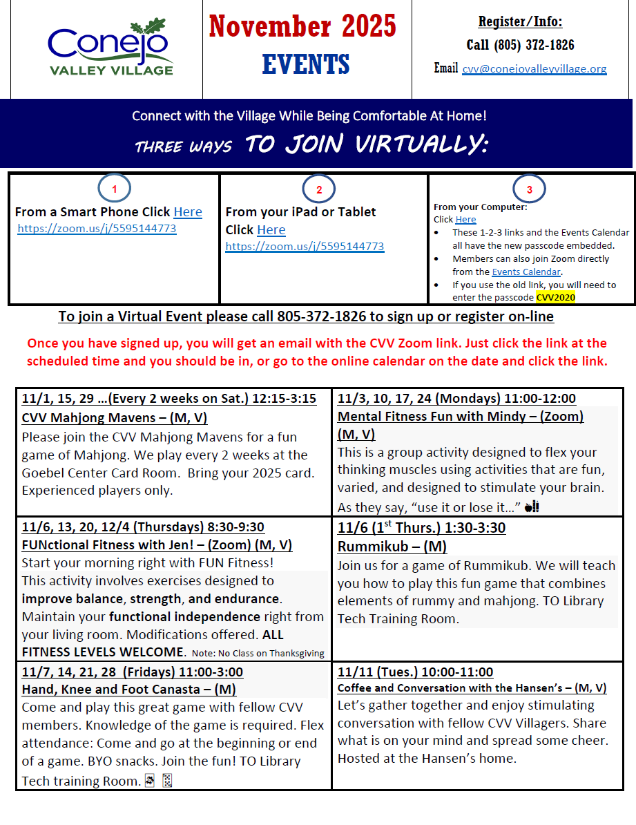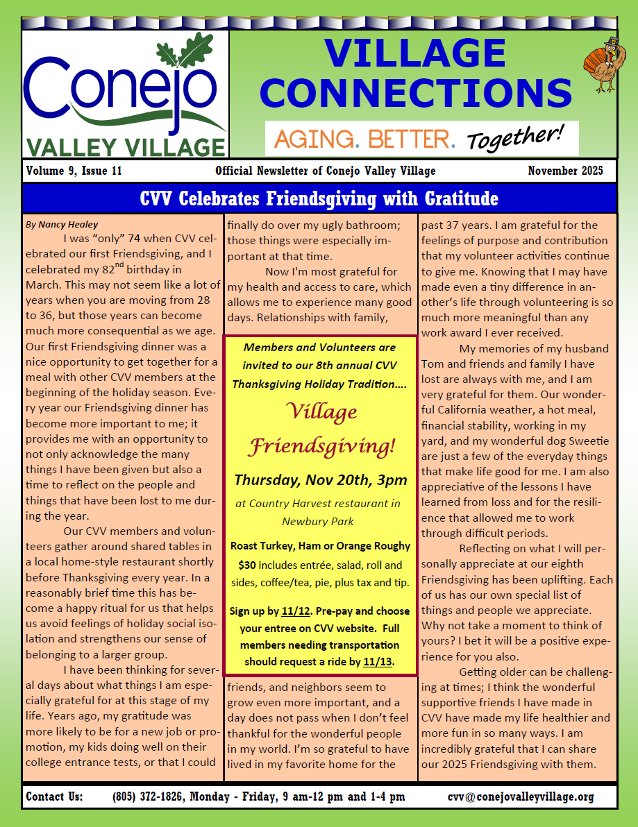 The Conejo Valley Village provides members with access to a network of trained and fully vetted local volunteers with just a phone call. The Village offers services and programs designed to help members stay active, connected to our community, and safely independent in their homes, optimizing their quality of life during the second act. Our 'neighbors helping neighbors' approach gives members and their families greater peace of mind, knowing a local support network is in place.